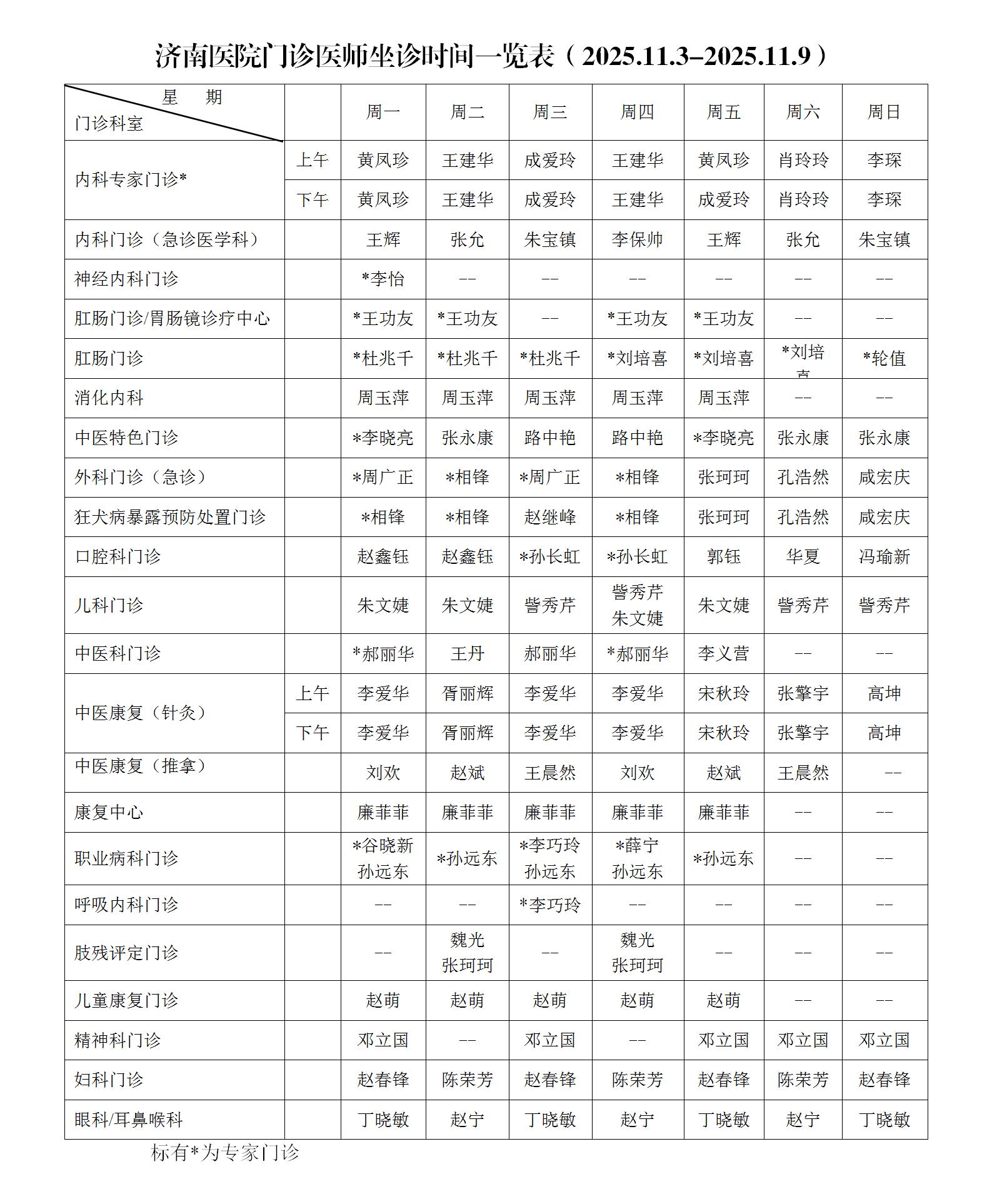济南医院门诊医师坐诊时间一览表(2025.11.3-2025.11.9)