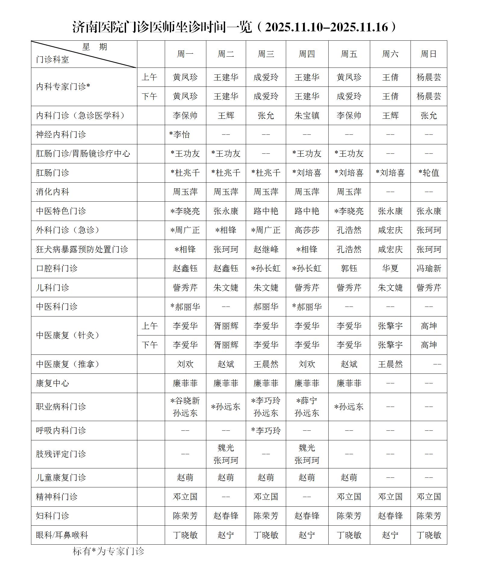 济南医院门诊医师坐诊时间一览(2025.11.10-2025.11.16)