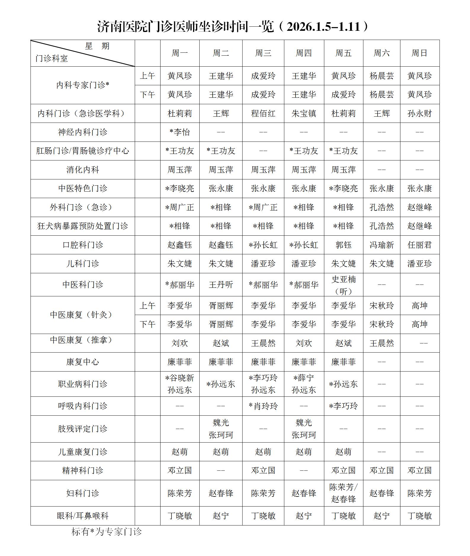 济南医院门诊医师坐诊时间一览(2026.1.5-1.11)