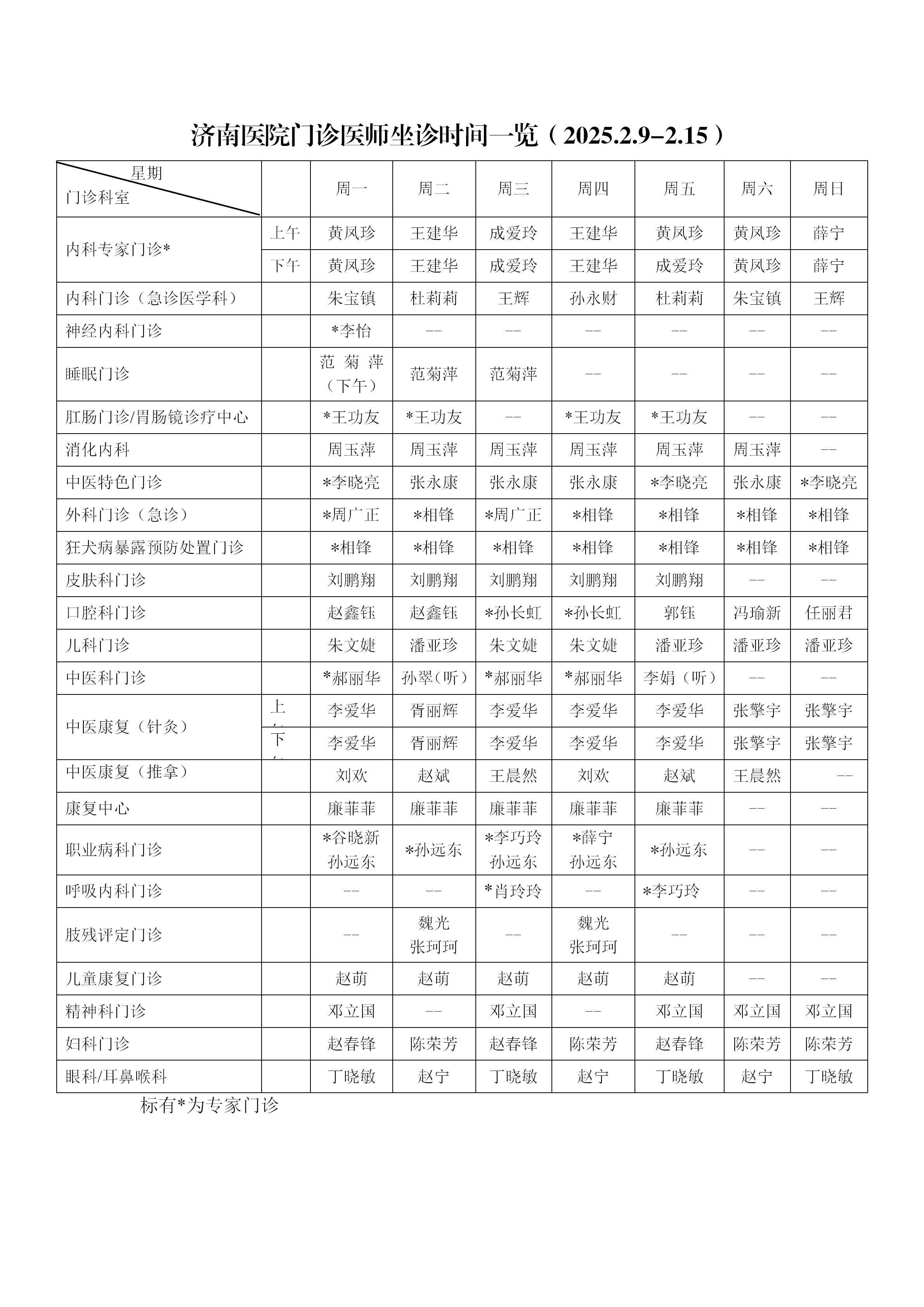 济南医院门诊医师坐诊时间一览(2025.2.9-2.15)