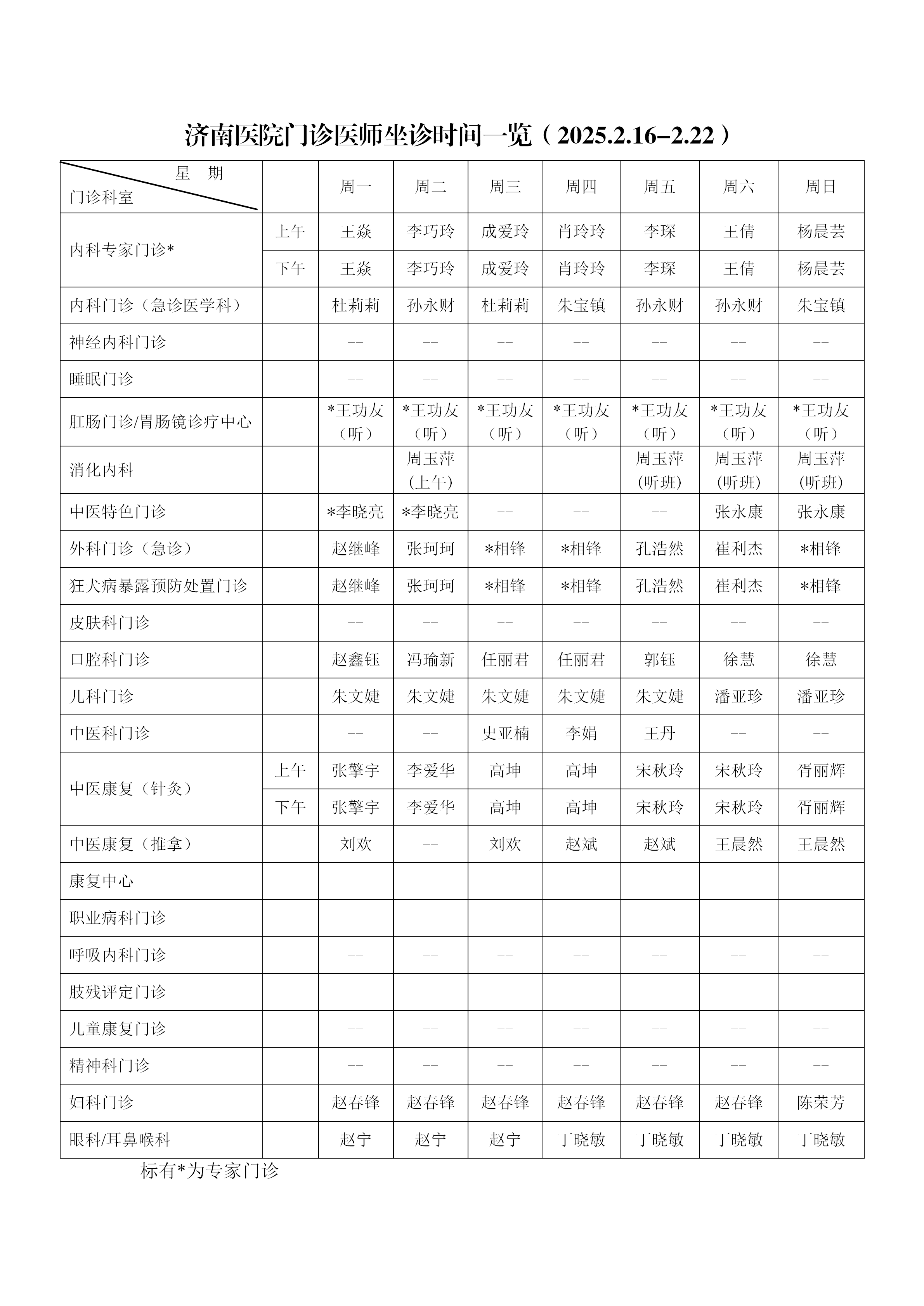 济南医院门诊医师坐诊时间一览(2025.2.16-2.22)
