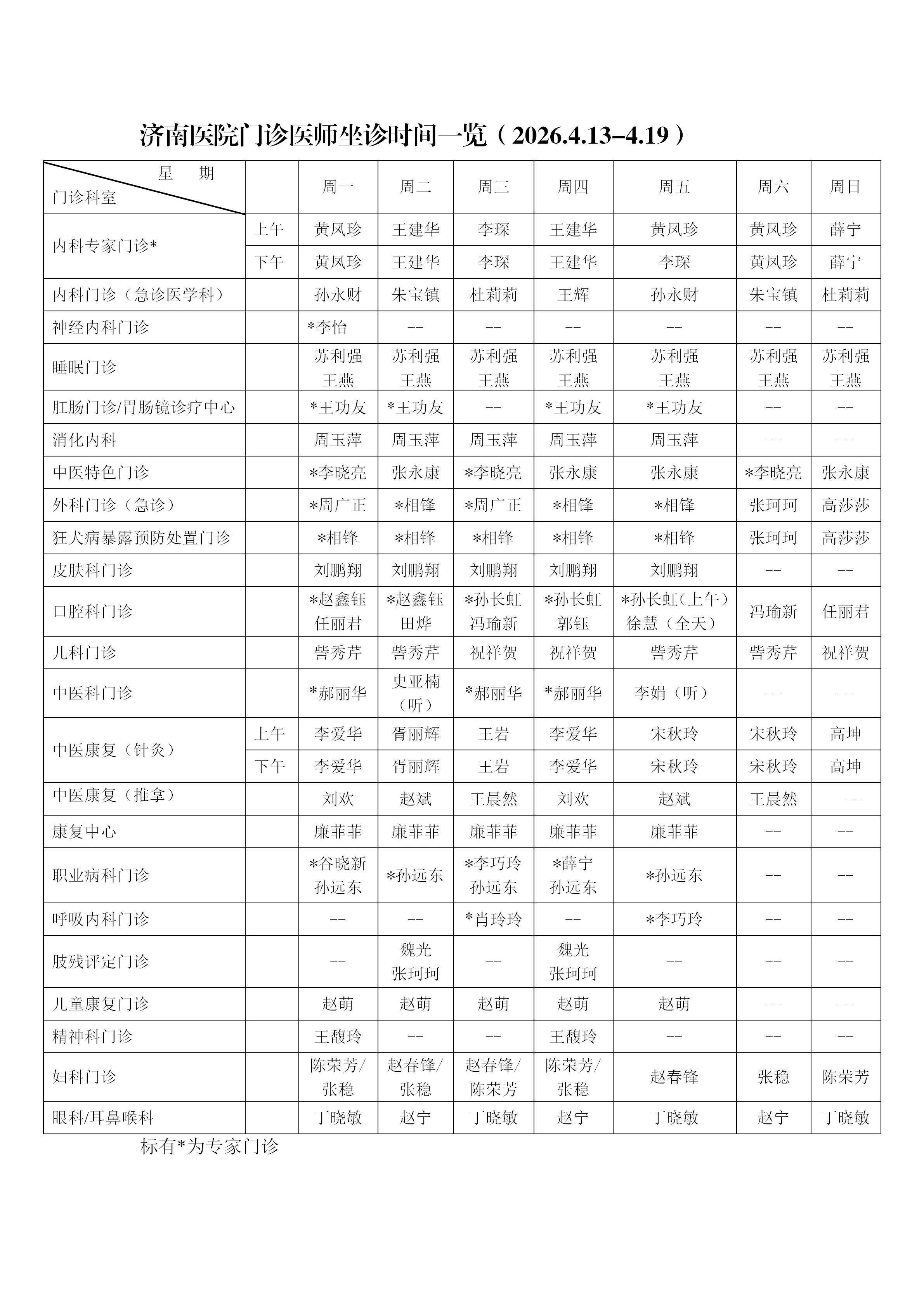 济南医院门诊医师坐诊时间一览(2026.4.13-4.19)