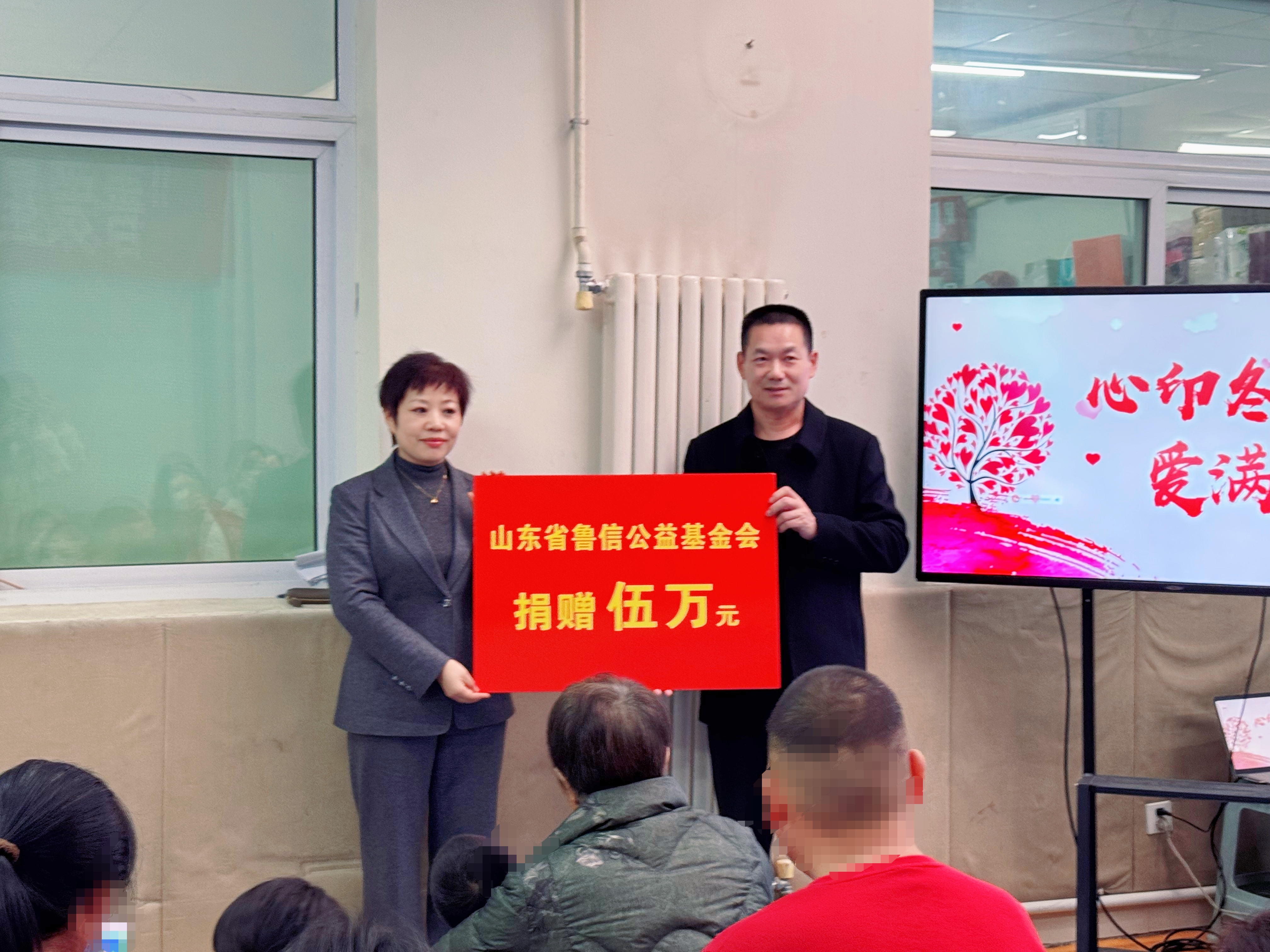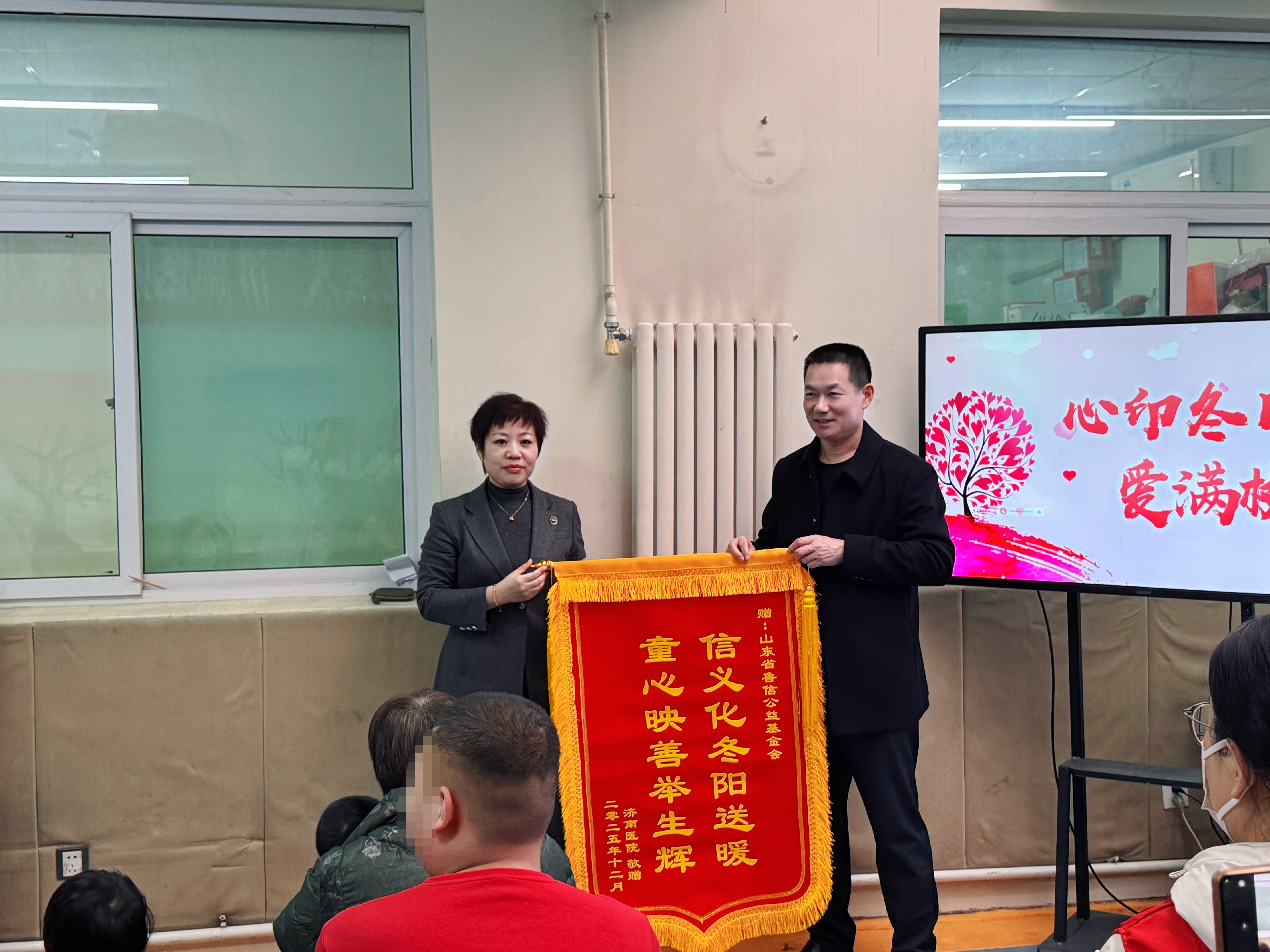 鲁信公益基金会向医院捐赠现金用于支持儿童康复项目。医院代表回赠锦旗和孩子创作的手工作品,以表谢意。
