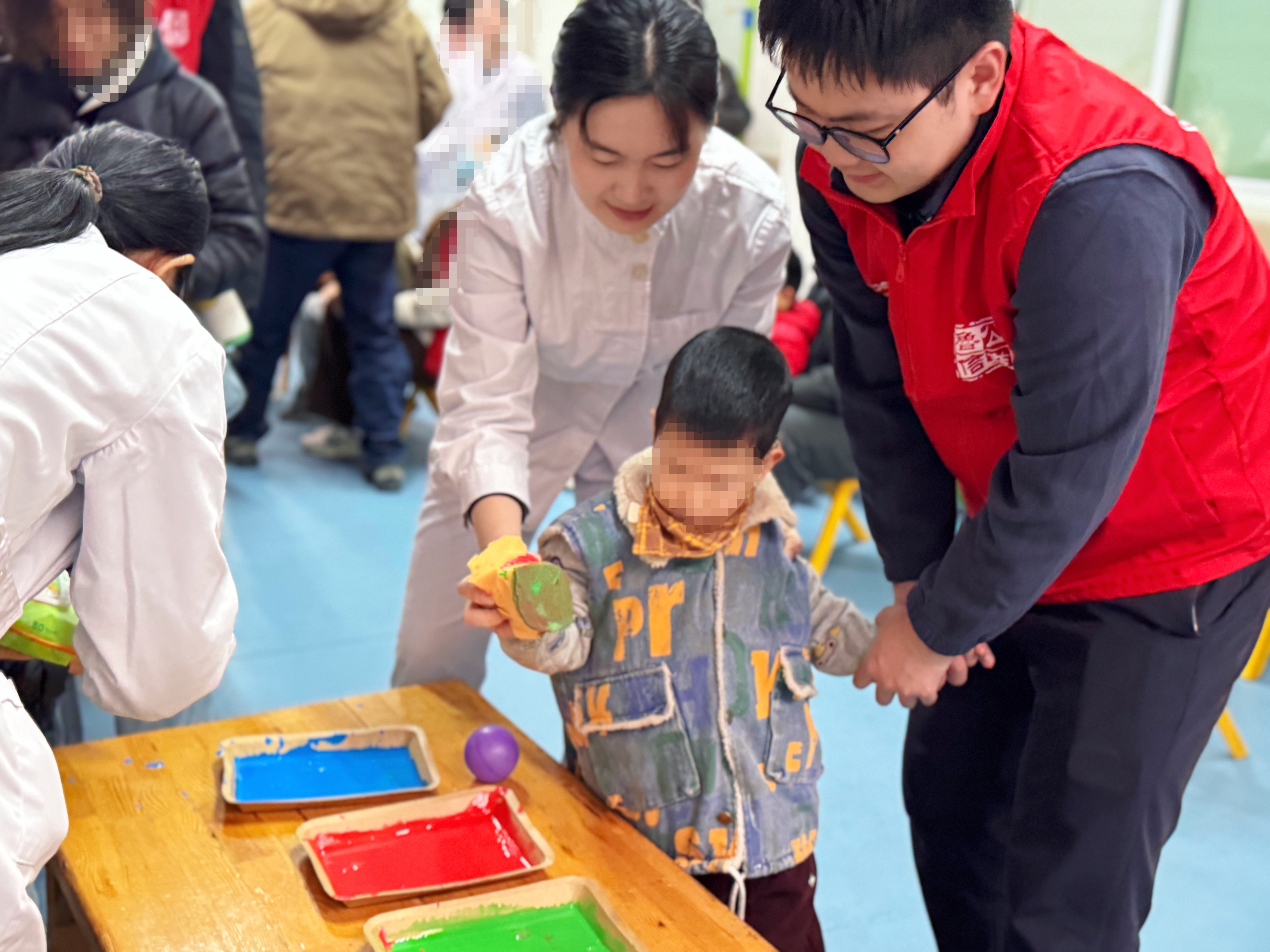 活动最后,治疗师与志愿者们共同带领孩子们开展“心‘印’冬日·爱满枝芽”集体创作环节。这不仅是一次艺术体验,更是爱心与希望的集体见证,象征着在社会的关怀下,每个孩子都能茁壮成长、绽放光芒。