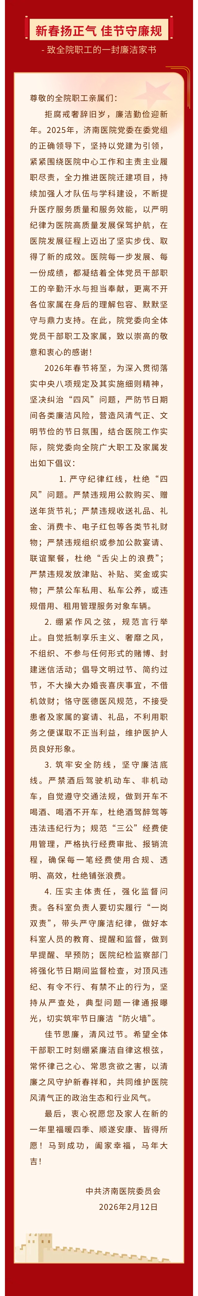 新春扬正气 佳节守廉规 - 致全院职工的一封廉洁家书